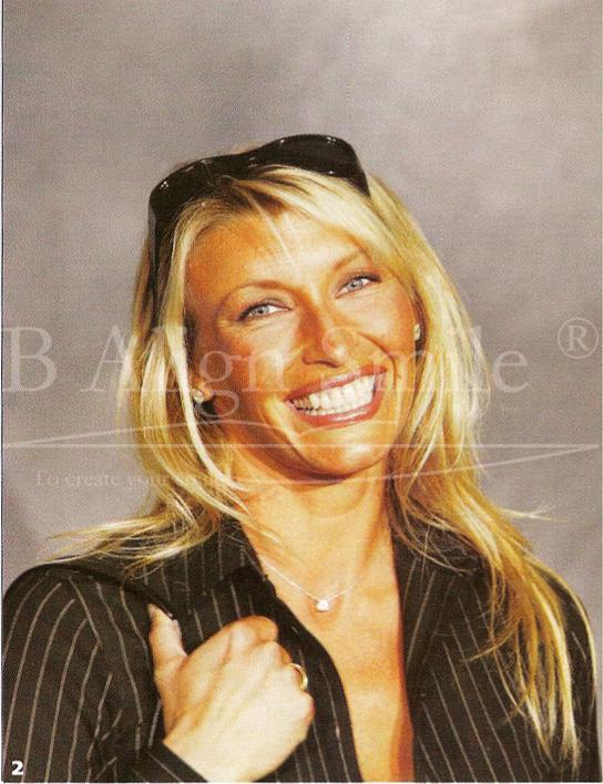 Sur cette image, nous observons que c'est l'étage supérieur qui a été artificiellement réduit. Le visage d'Estelle en devient immédiatement moins esthétique et l'impression diffuse qu'il dégage est que nous avons là affaire à une personne dont l'intelligence, l'esprit, la spiritualité à l'air moins développée que dans l'image originale. L'étage supérieur étant celui qui symbolise la vie intellectuelle. Évidemment, les petits fronts ne signifient en rien que les personnes sont moins intelligentes, mais cela leur donne l'image de quelqu'un de moins cérébral. Ne dit-on pas de quelqu'un qu'il a le "front bas" pour remettre en question son intelligence? De même sur la photo 3, le trucage a réduit l'étage moyen, celui de la respiration et des états d'âmes. Le visage semble écrasé, étouffé, comme si le nez ne remplissait plus sa fonction essentielle de filtre et de conformateur fonctionnel. Notre star paraît alors moins épanouie dans sa dimension pulsionnelle et affective. Le sourire n'a pas bougé, ni les yeux, seules les proportions ont changé.Observons également la photo 4 dont le maquettiste a retouché en trucage le menton, réduisant ainsi l'étage inférieur du visage. La belle Estelle semble rentrée sur elle même, elle gagne en image de vie intellectuelle mais perd assurément en sensualité. L'étage inférieur étant celui de l'activité instinctive et physique. Dans les deux cas de trucage, son sourire paraît trop grand, donc moins subtil, plus vulgaire alors qu'il conserve la même taille en valeur absolue et en valeur relative pour tous les éléments non-truqués, c'est à dire la plupart des autres éléments du visage, qui n'ont pas été modifiés. Toutes les modifications des étages engendrés par thérapeutique modifient la perception du sourire. Au cabinet, il est souvent peu pratique de mesurer les proportions du visage de vos patients.Effectuez donc l'analyse à l'aide de photoq que le patient vous aura apportées ou que vous aurez réalisé vous-mêmes. N'hésitez pas à utiliser un double-décimètre pour ne pas faire confiance à la subjectivité de votre oeil, du moins au début. Une fois l'analyse des étages effectués, vous saurez conseiller votre patient de modifier la DV par la prothèse, déplacer les dents par orthodontie, déplacer les bases osseuses par chirurgie orthognatique , maquiller les déséquilibre des étages par dentisterie (préférer éclaircir son sourire pour mettre en valeur l'étage inférieur de petite dimension), par chirurgie plastique rhinoplastie, réinjection de graisse, lifting greffe de cheveux) dermatologie ou esthéticienne pour modifier les reflets de la peau. Le sourire ne vit pas seul, il est intégré dans un corps et dans un visage, apprenons à "lire" ce rapport pour mieux intégrer nos travaux dans l'ensemble du corps de notre patient.