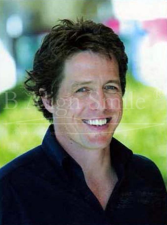 Le sourire lui aussi étroit, dans un espace buccal qu'il ne remplit pas tout à fait, provoque des triangles noirs de chaque côté. Ces zones d'ombre contribuent à amplifier l'impression de sourire perdu dans une grande bouche. Les incisives, longues et fines, débordent de la ligne du sourire vers le haut et vers le bas, ce qu'il est covnenu de donner comme critère de féminité. La position bien verticiale des canines qui ressortent comme des crocs leur donne de la force mais accentue l'aspect irrégulier du sourire. Le tout contribuant à donner l'image d'un homme fragile et sensible. On dira qu'il y a non correspondance entre le forme du visage et l'arcade dentaire voire le maxillaire. Quelques malpositions dentaires achèvent le portrait avec un non-alignement des deux arcades et des chevauchements incisivo-canins maxillaires et mandibulaires.